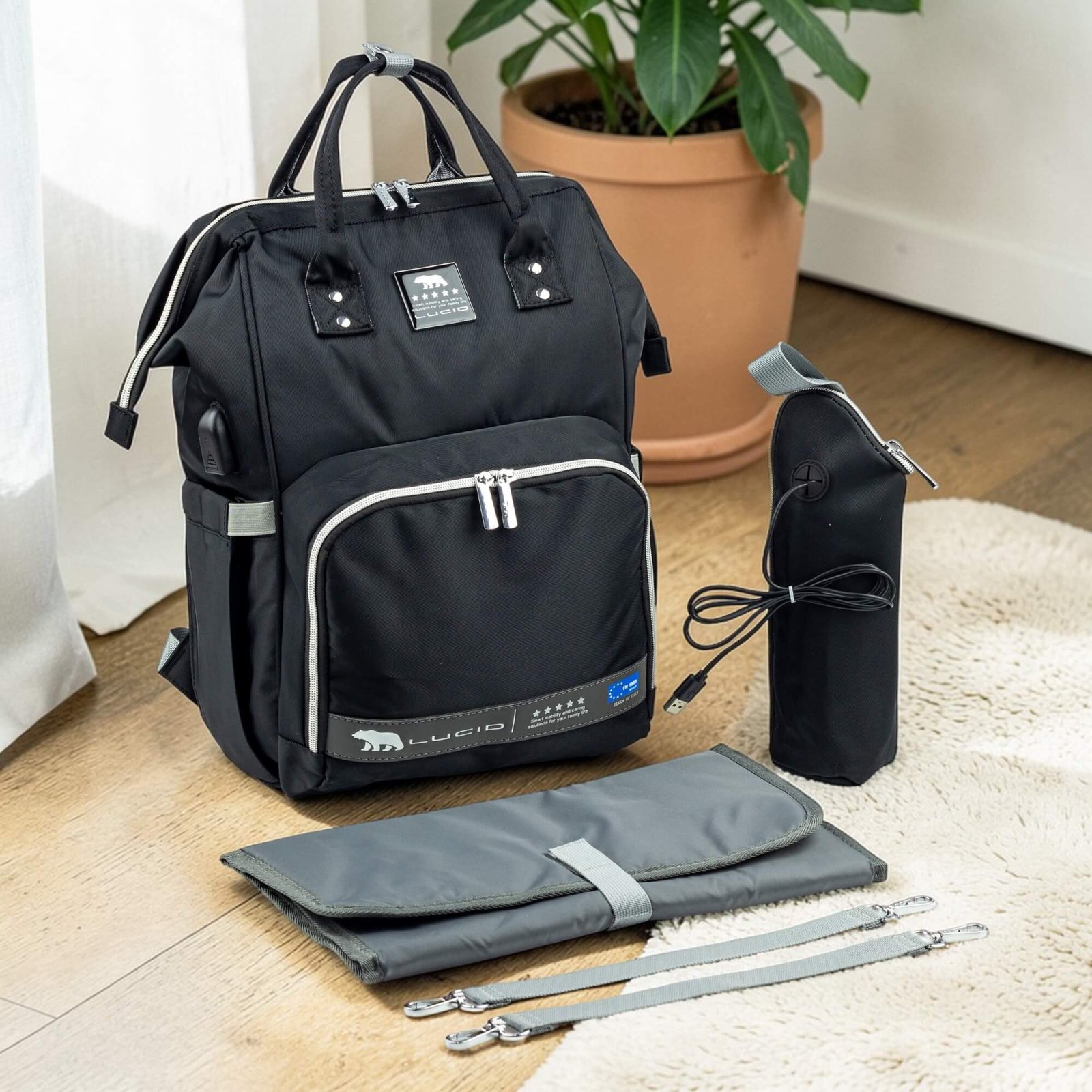 حقيبه لوازم الأمهات الإصدار الاحدث من لوسيد مقاومة للمياه مع مفرش غيار وحافظه للببرونه حراريه بوصله تسخين ومزوده ببطانه طبيه للظهر-اسود